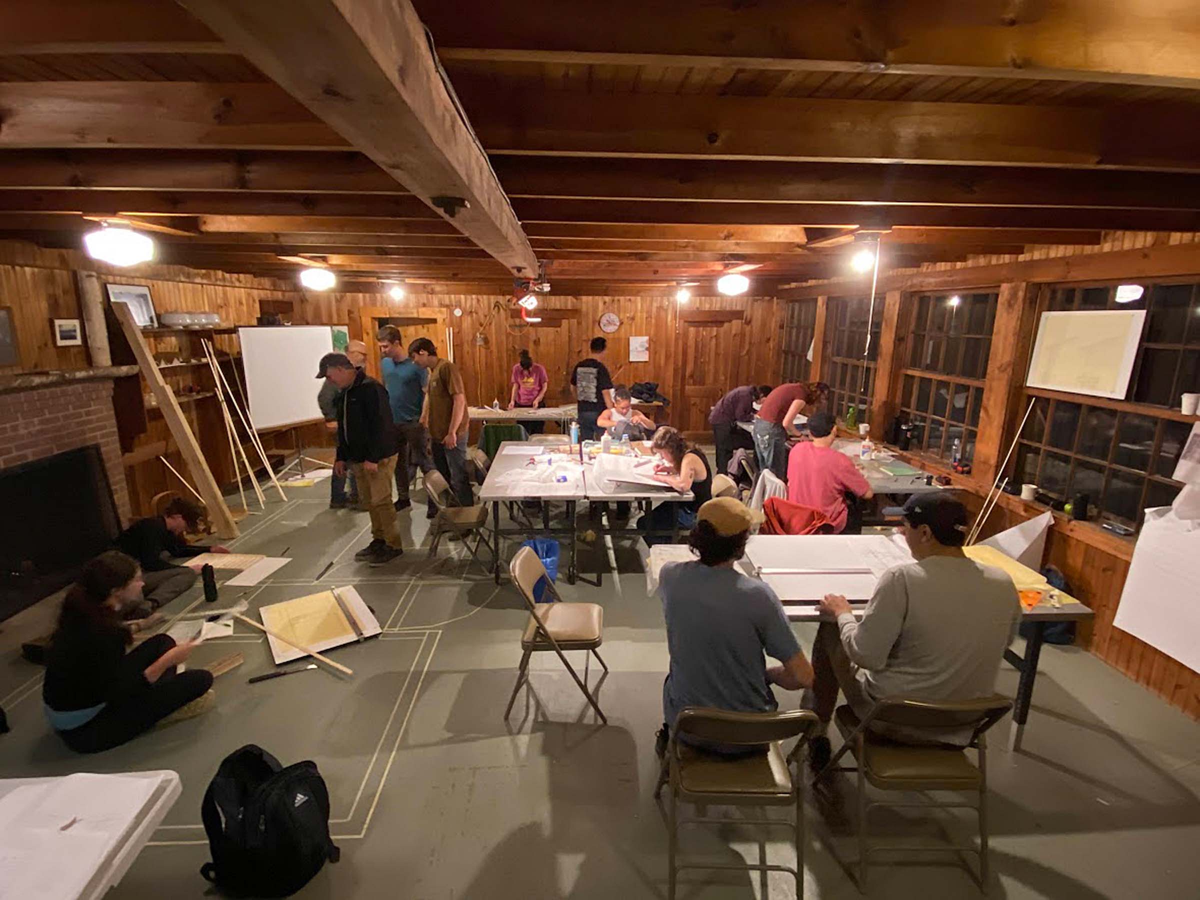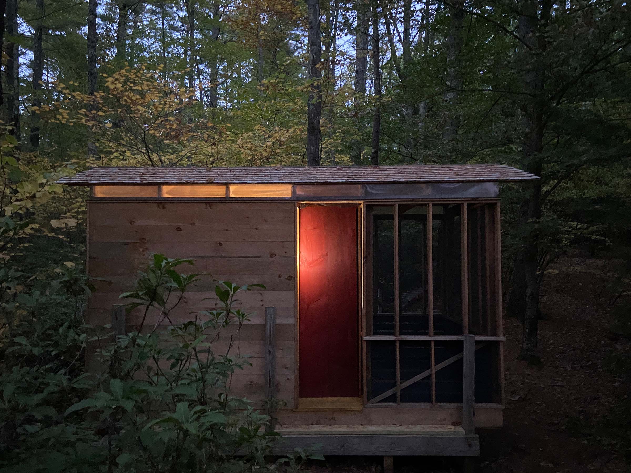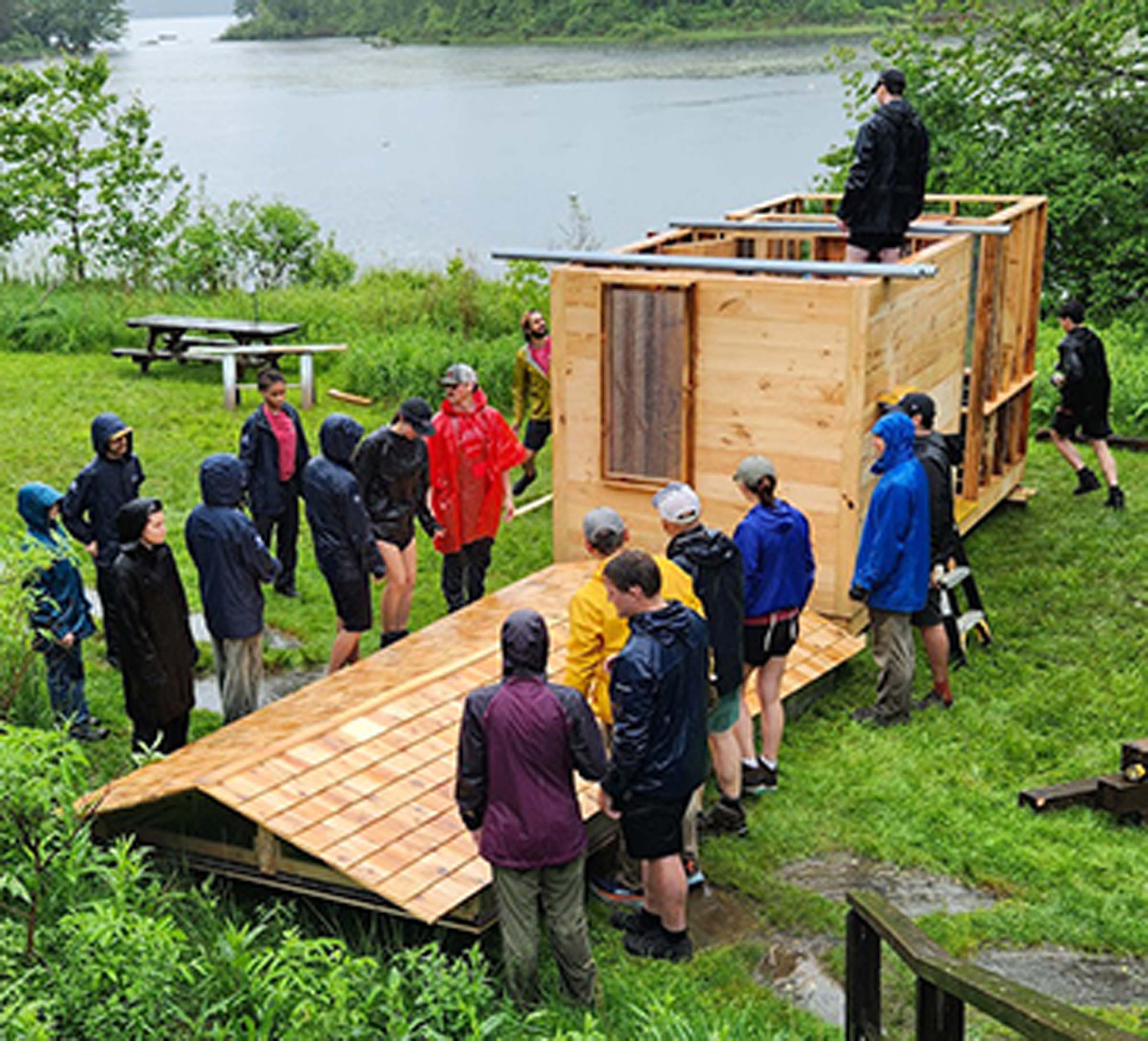 The 2025 Design Assembly produced a caretaker's cabin for Squam Lakes Association, a non-profit conservation and education organization. After a brief exhibit at the SLA main campus, the cabin was permanently placed on an old tent platform on a point of conserved forest land owned by the New England Forestry Foundation. This little building was made with native wood that was grown, harvested, milled, and seasoned right on the shore of Squam Lake.