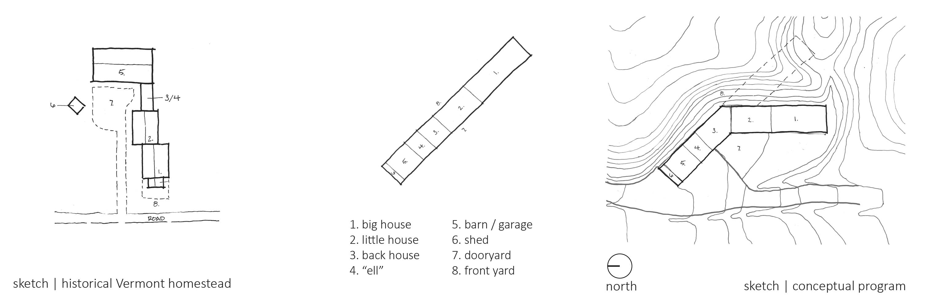 Long House draws design influence from the Vermont homestead of the 1800s. This historical configuration is sometimes described as “big house-little house-back house-barn.” These main components were often connected and arranged around an exterior space called a “dooryard.” Additional outbuildings cropped up as needed. Examples of these homesteads still exist throughout Vermont in large numbers today,