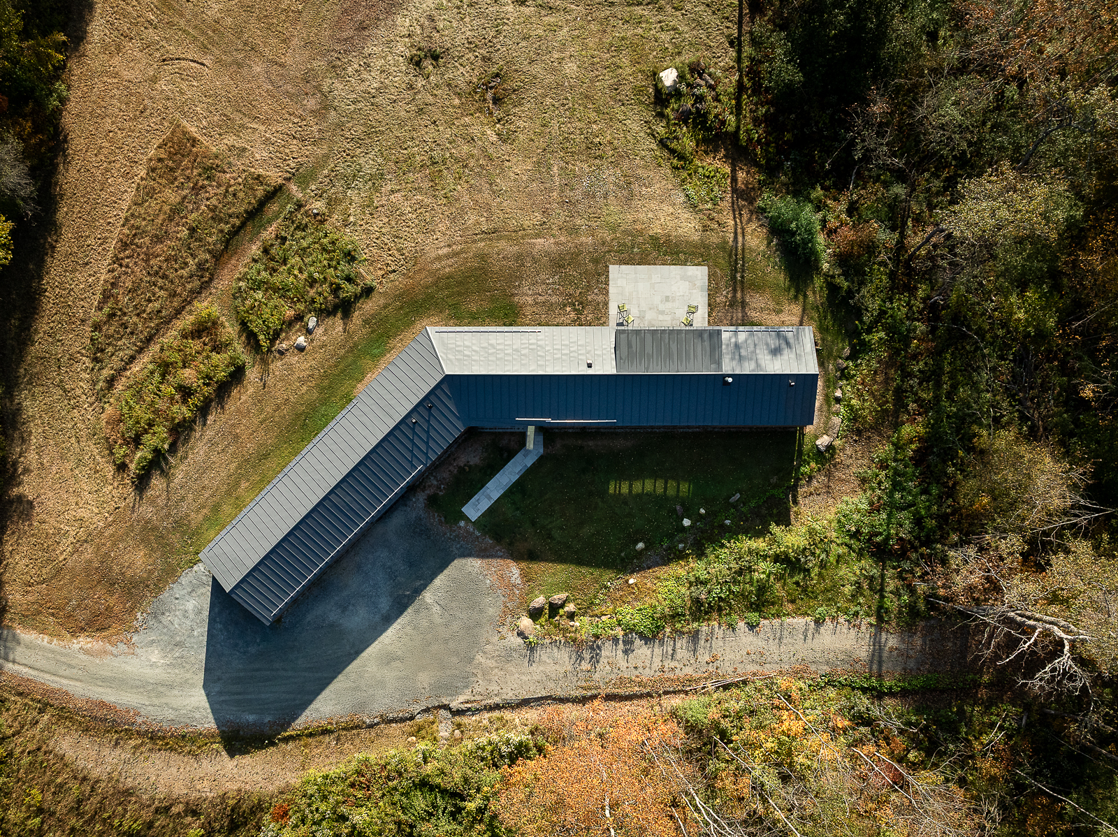 The client's programmatic needs resembled the traditional homestead components; however, due to site conditions including restrictions on three sides by grasslands, woodlands, scrublands, and wetlands, the “big house-little house-back house-barn” components got configured into a long bar that was then bent to follow the contours of the land. The resulting bent form, following a knoll, provides unobstructed views from every primary room in the house, across the field and down the valley. The interior side shelters a modern “dooryard” with the main entry at the hinge point.